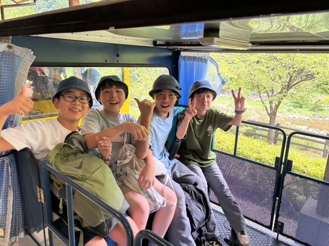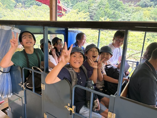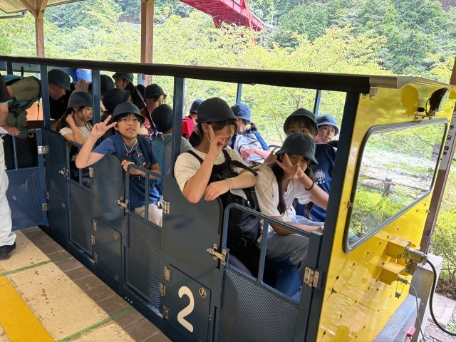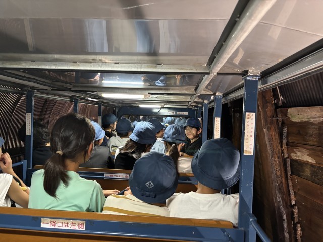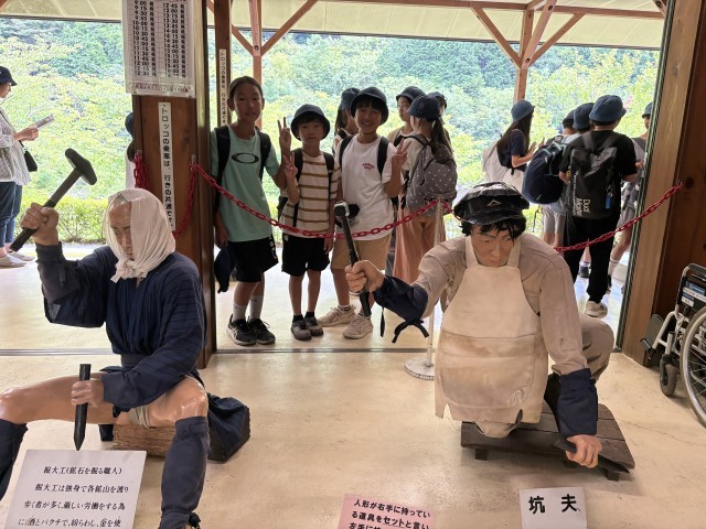 トロッコに乗って坑道に入るとひんやりします。39体の蝋人形が当時の様子を再現している姿を、真剣に見たり、説明を聞いたりしています。日光現在の気温は29度です。