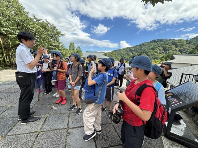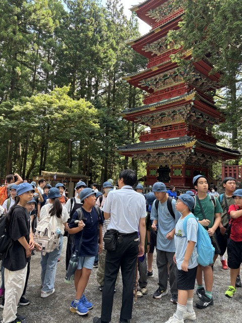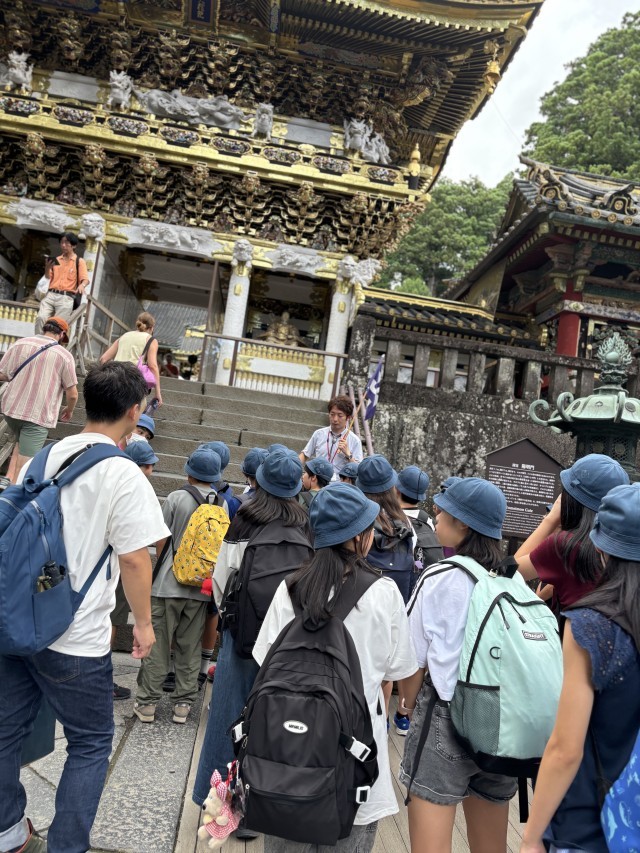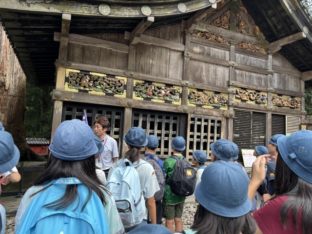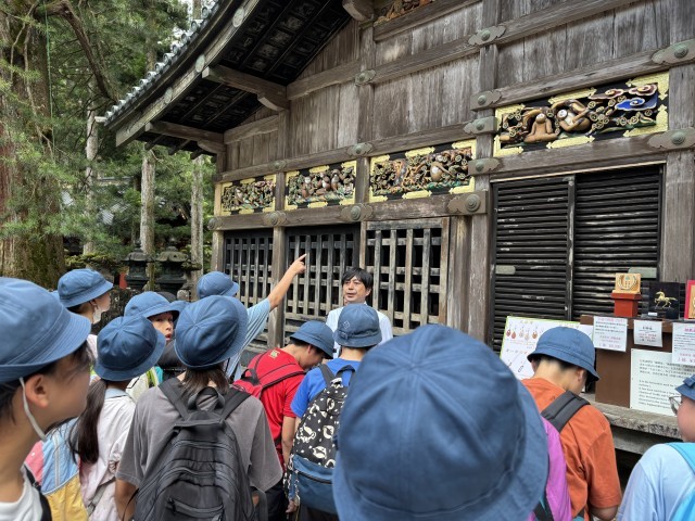 世界遺産の日光東照宮に到着しました。案内人の方が説明してくださり、子どもたちも真剣に聞いています。