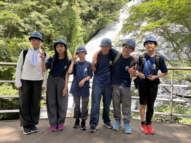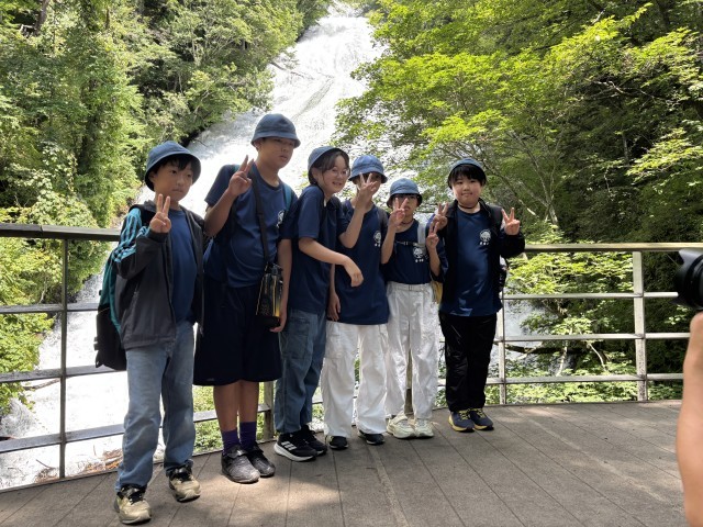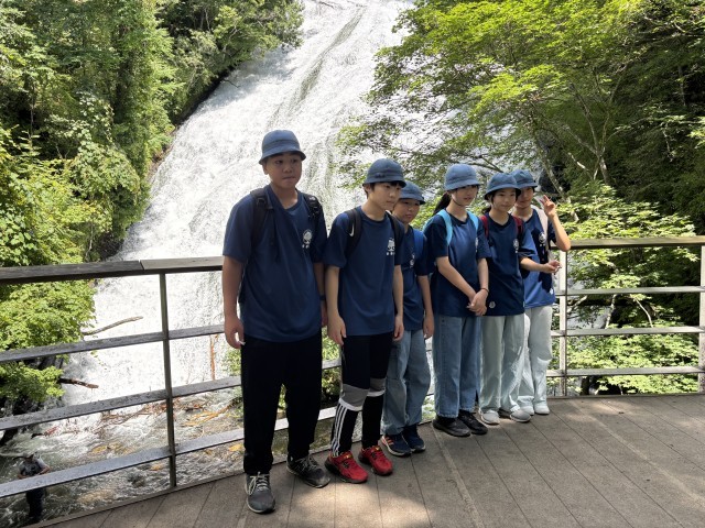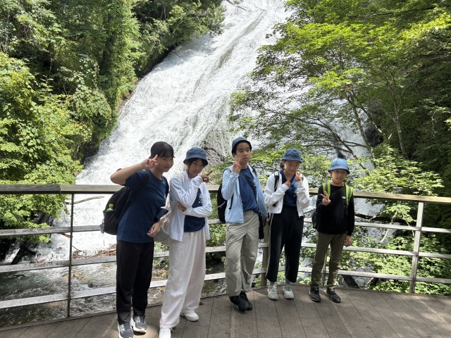 湯の湖湖畔を歩き、湯滝に到着しました。湯の湖から流れ落ちる落差50mの豪快な滝です。グループごとに写真を撮りました。清涼感をみんなで満喫しました!