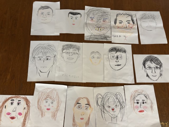 子どもたちが班ごとに描いた担任の先生の似顔絵です。どの列がどなたでしょうか?