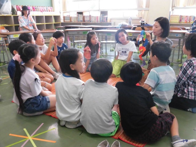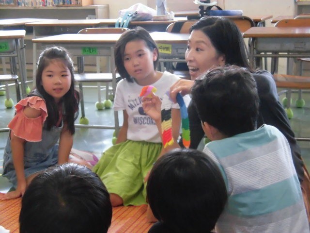「英語を上手にしゃべれなくてもいいんだよ、英語を楽しもう!」という先生の言葉で講座スタート!まずは英語で色を言いながら体を動かしました。絵本で英語の音に触れたり、サンキャッチャーを作って外国の文化に触れたり。最後にはビンゴをして盛り上がりました。