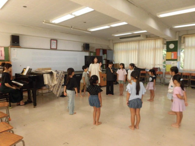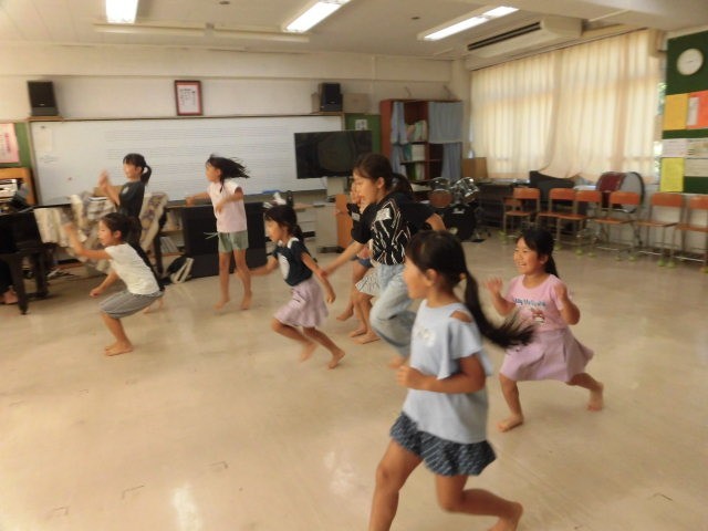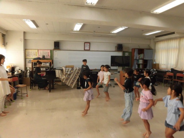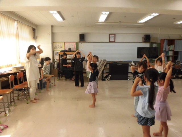 ピアノの生演奏に合わせて、イメージしたものを体で表現しました。いろいろな動きを行う中で少しずつ緊張がほぐれていった様子でした。すてきな演奏に耳を澄ませたり、果物に見立ててダンスをしたりして楽しみました。