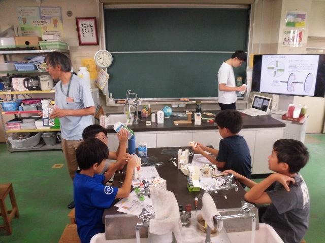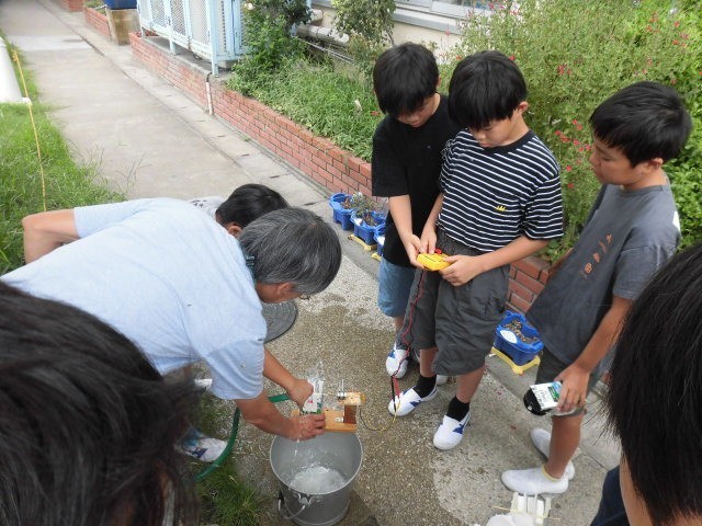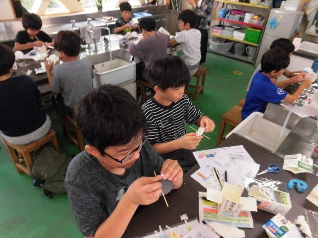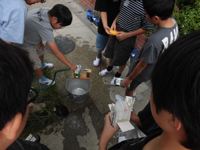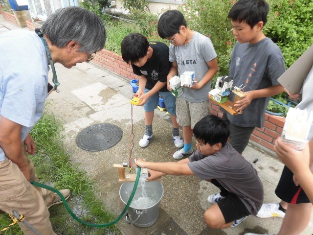 牛乳パックや発泡トレーなど、身近にある材料を活用して水車を作りました。細かな作業にも集中しながら頑張りました。作った水車をモーターにつなげて、ホースから水をかけることで発電することができました。