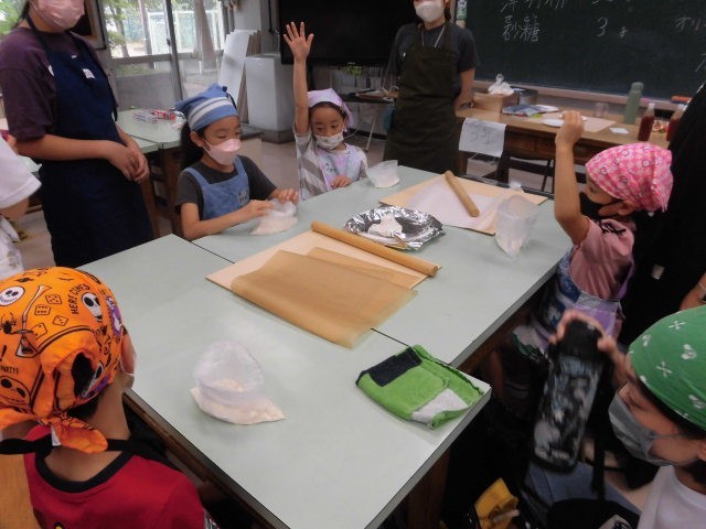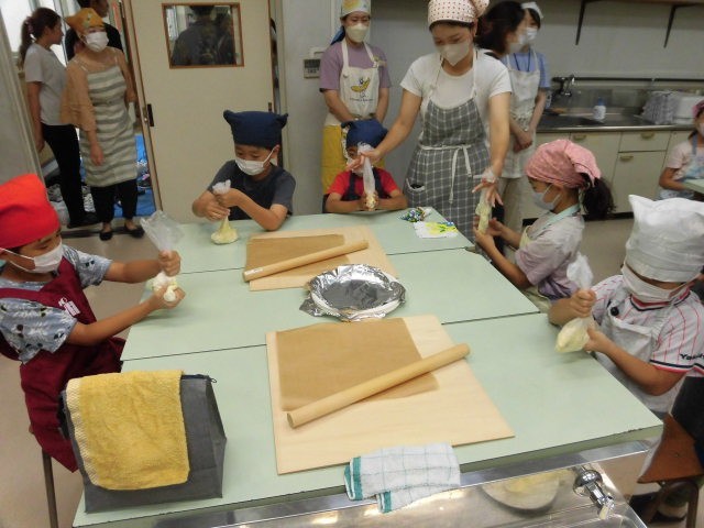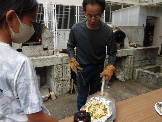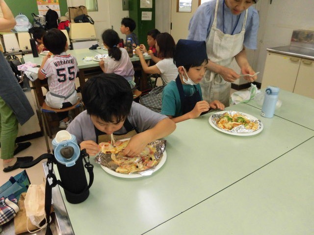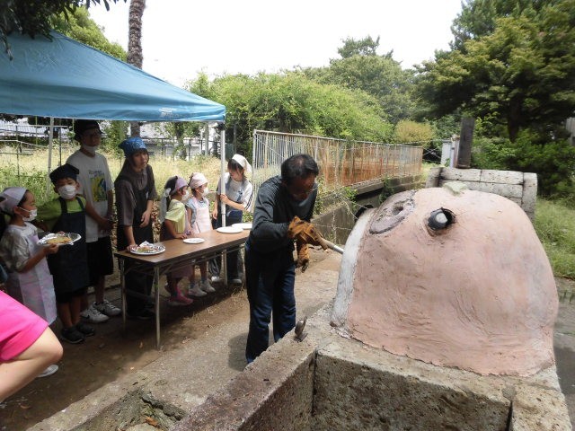 学校にある窯を使って、ピザを焼きました。たぬきのデザインになっているすてきな窯もあります。窯で焼くと、1分もかからずにピザが焼き上がります。窯の中の様子も楽しみながら、美味しいピザが出来上がりました。