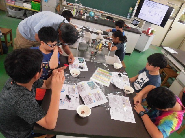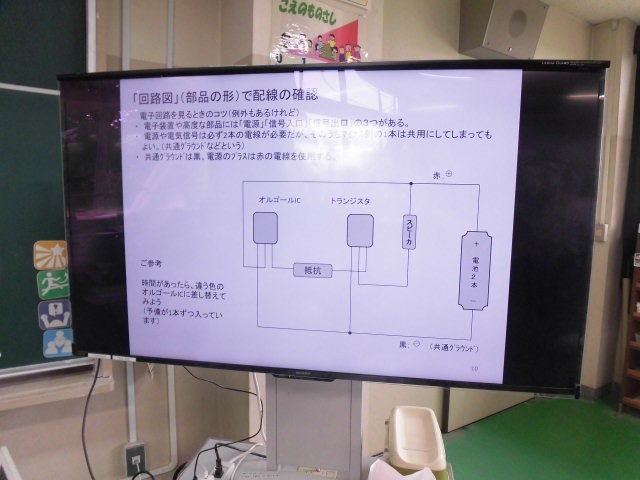 「ブレッドボード」という板にいろいろなパーツを差し込んでスピーカーを作りました。差し込む穴が1つずれただけで、音が出なくなります。うまく音楽が流れたときは、みんな大喜びでした。
