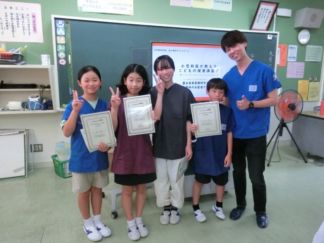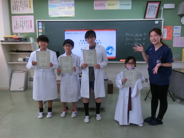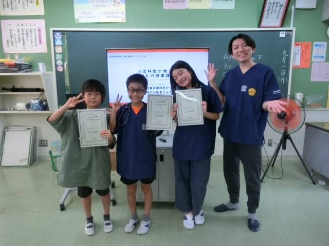 けがの手当てや熱中症のことなどについて、チーム対抗戦のクイズ形式で楽しく学んでいきました。これからも元気に生活していくためのヒントをたくさん知ることができました。全員、「じぶんのからだ専門医」認定です!