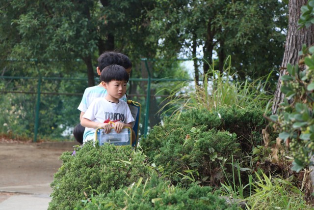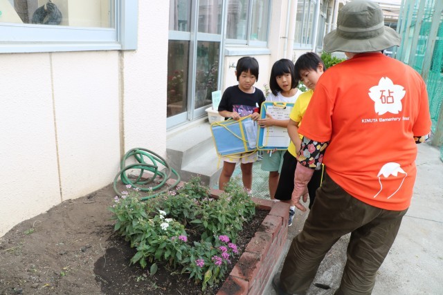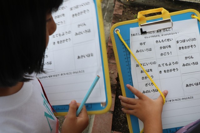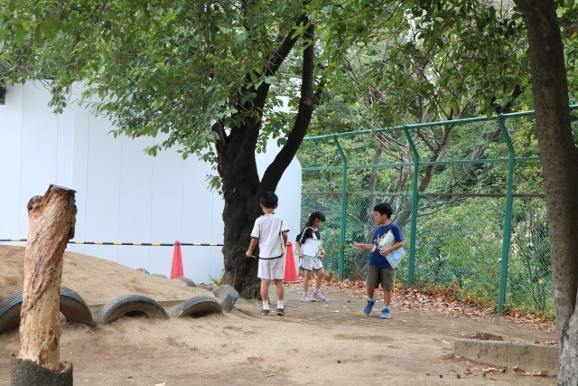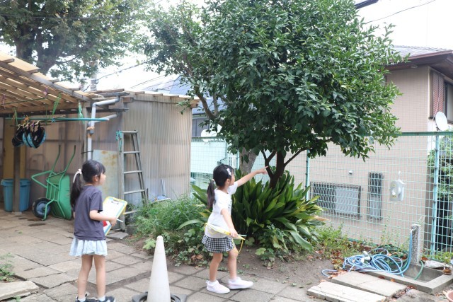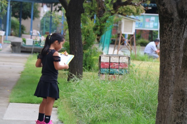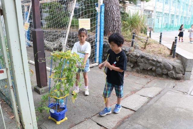 1年生生活科の様子です。校庭に出て季節の植物の様子を観察します。先生からもお題が出ているので探しながら、また新たな発見をしながら校庭を隅々まで観察しています。花壇の手入れをしている主事さんにもいろいろなことを教えてもらっていました。