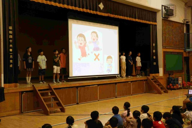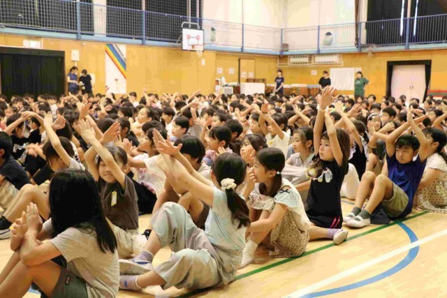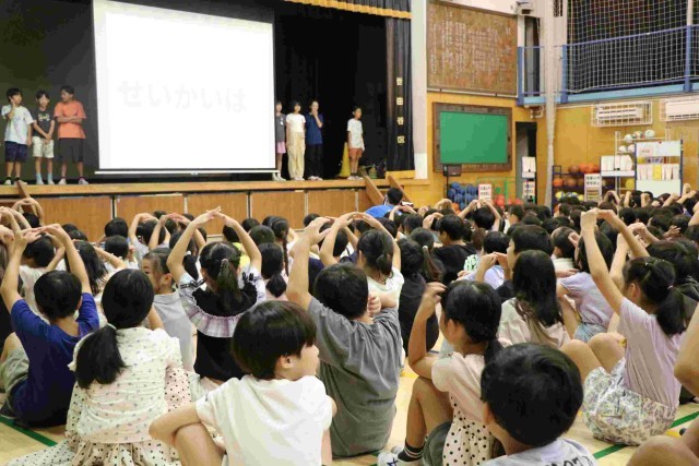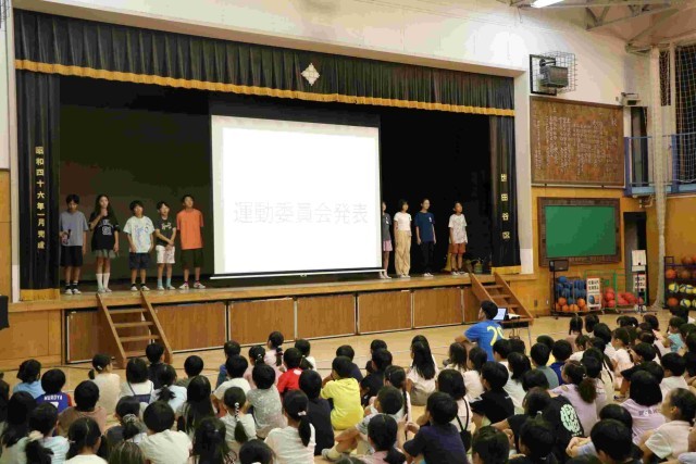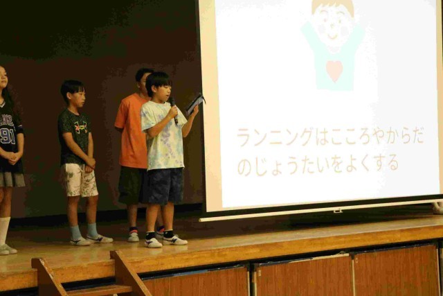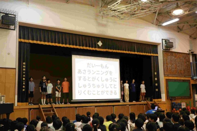 集会が終わって教室に戻る時の音楽は、いつもの行進曲ではなく、ランランランの曲でした。他学年を待っている間、その場で楽しくランニングをしている学年もあり、微笑ましかったです。