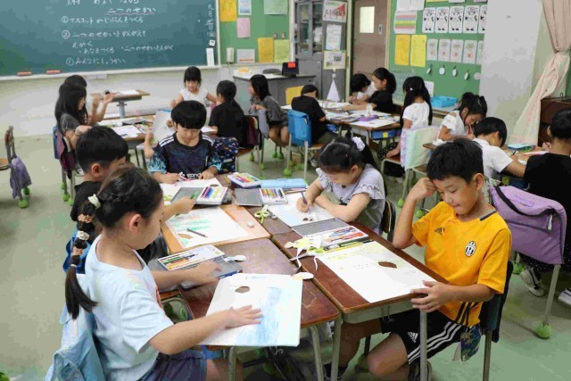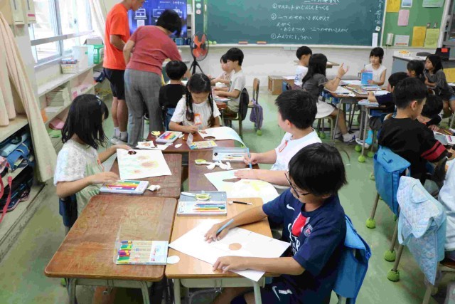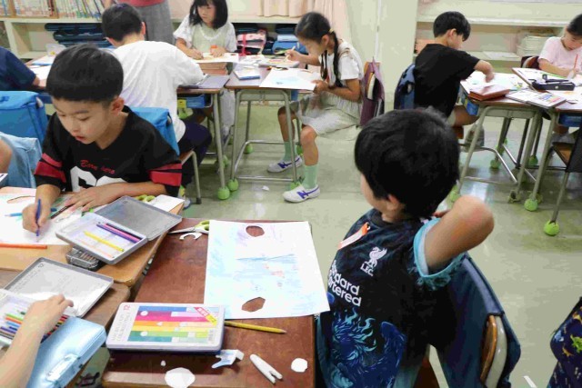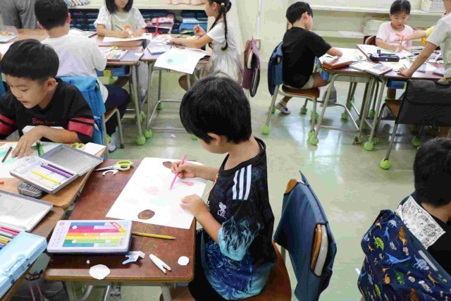 紙に穴をあけてから絵を描いていました。それだけでも、いつもと違う課題なのですが、なんと裏にも絵を描いていました。表に描いた世界と裏に描いた世界は、穴でつながっているのだそうです。おもしろい題材に取り組んでいました。