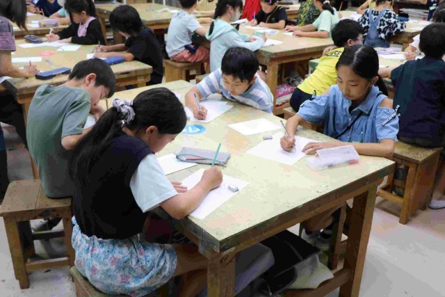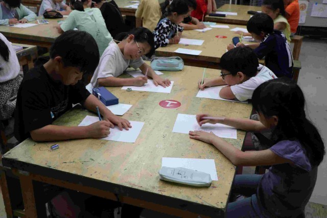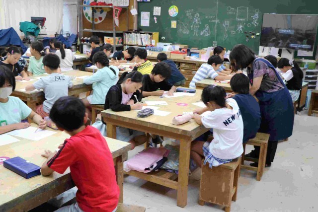 ○と△と□で人が描けることを教わり、子どもたちは「分かりやすかった」「いいことを教えてもらった」と言いながら楽しく描いていました。○と△と□で描いたのに、なぜか生き生きとした絵ばかりで、不思議な魅力を感じました。