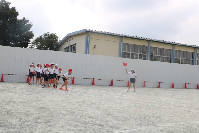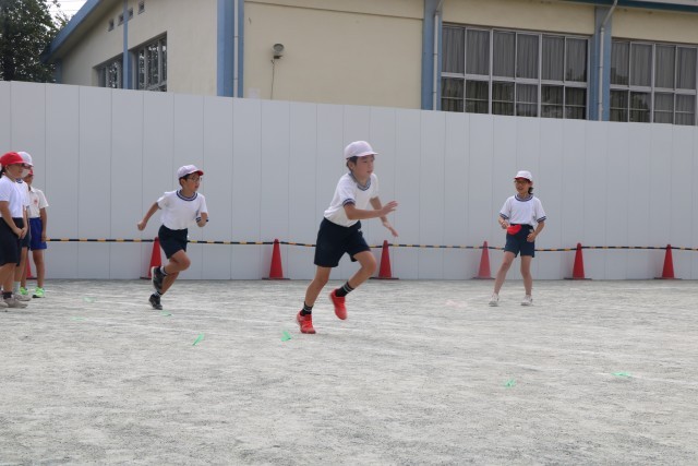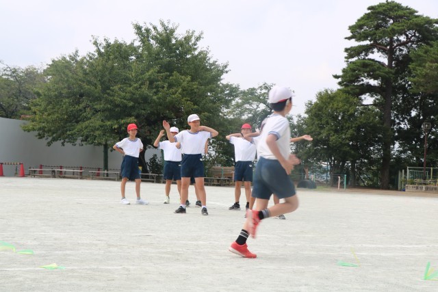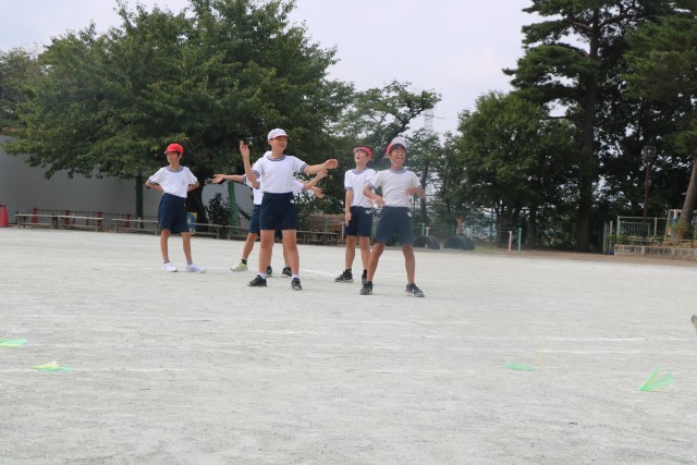 5年生体育の様子です。準備運動をして今日の学習の「走」の運動についてポイントを確認し、短距離走に挑戦です。改築準備工事のため校庭のトラックは少し小さめですが、コーナーを走るときの体幹を意識しながら精いっぱい走る5年生です。走り終えた子が順に記録を取ったりスターターをやったり、大きな声で応援する姿がさすが5年生です。