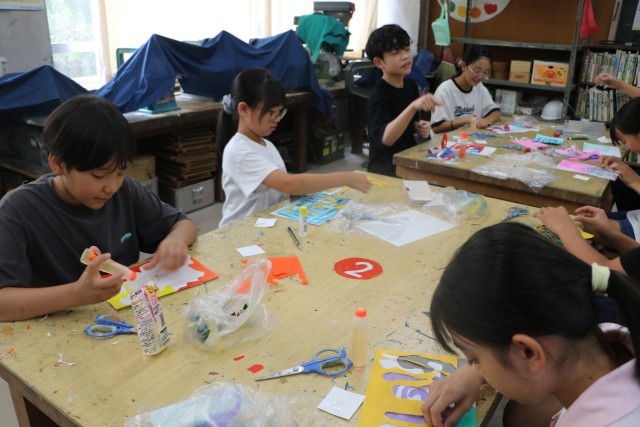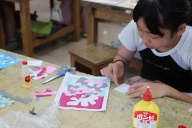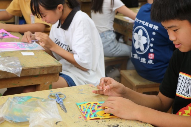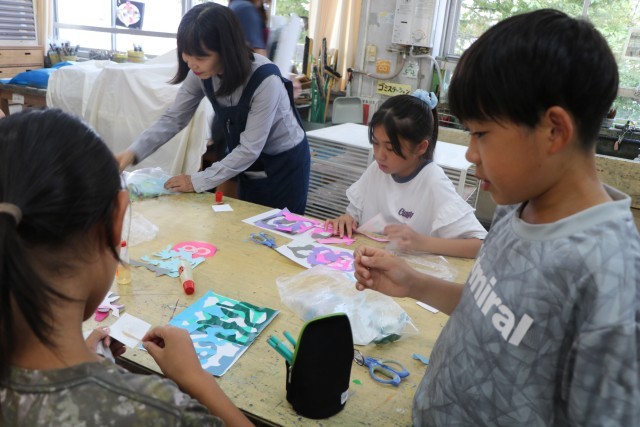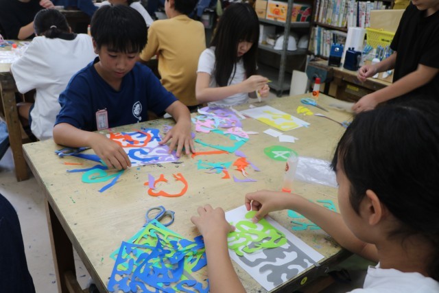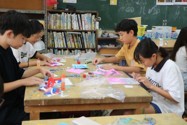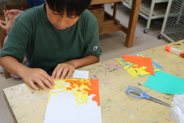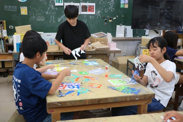6年生図工「紙が奏でる色と形のハーモニー」の様子です。折り紙を使って集中して作品に取り組んでいます。色の重なり、台紙の白い部分とのバランスなどそれぞれに味があり、個性が光りすてきな作品ばかりです。