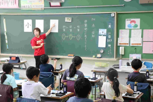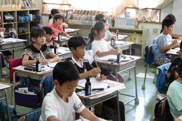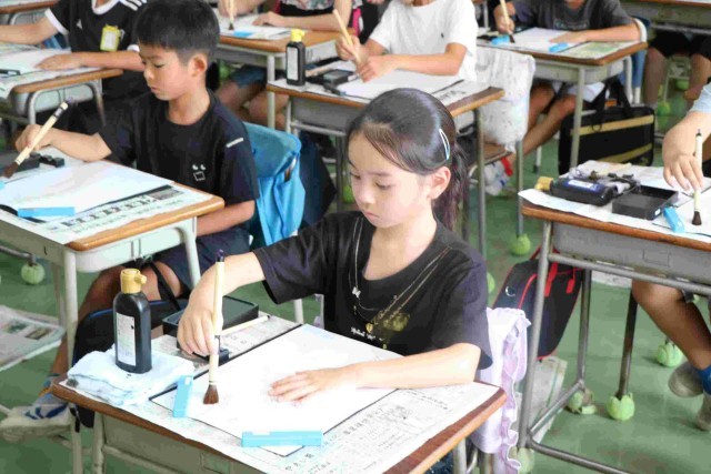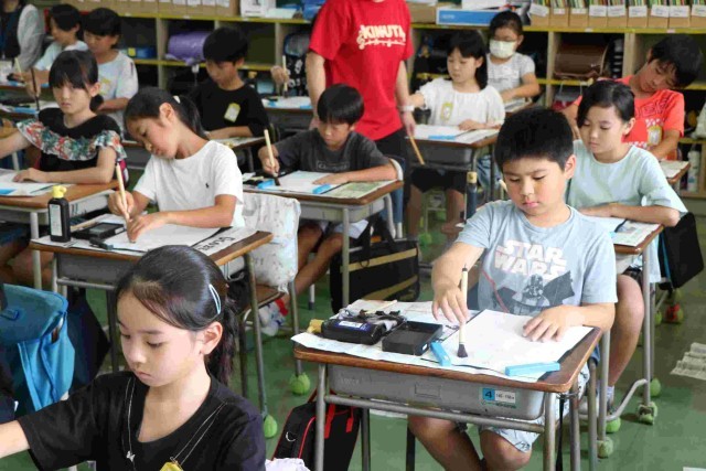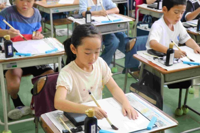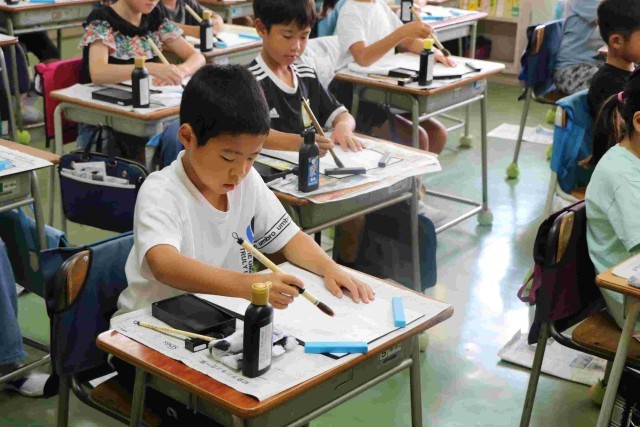 1学期の学習を思い出して、力の入れ方や筆の動かし方などを復習していました。皆、姿勢がとてもよいです。
