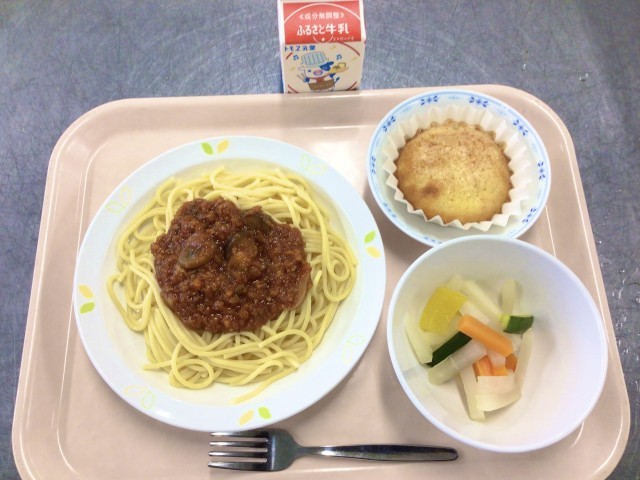 朝からミートソースの野菜をじっくり炒めるいい香りが校内に漂い食欲を誘っていました。スパゲッティもケーキも子どもたちから大人気でした。ジメジメした気候にさっぱりしたピクルスも良かったようです。