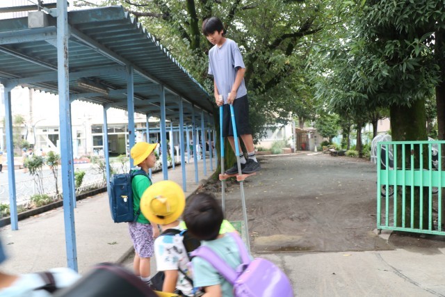 朝遊び、ランランランの様子です。高い竹馬を、さらに高くしてもらい楽しんでいるのは6年生です。登校してくる子たちもビックリです。