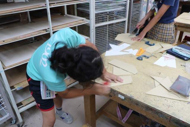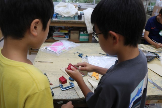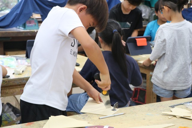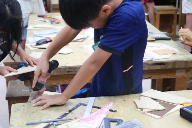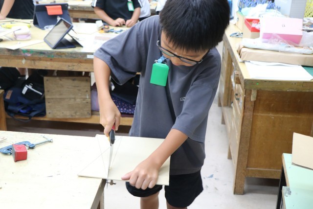 4年生図工「かくかく板を組み合わせたら」の様子です。のこぎりで板を切り、切った板のバリ取りをします。切った形を組み合わせてどんな作品になるか楽しみです。