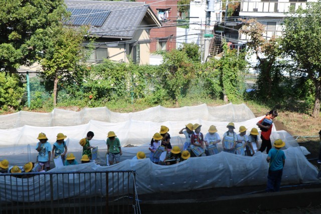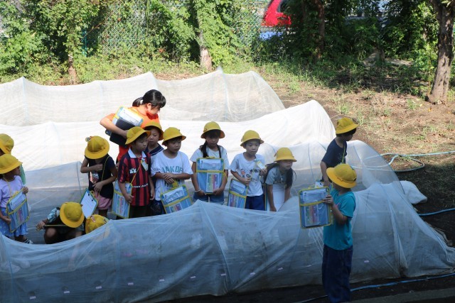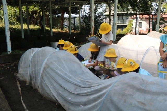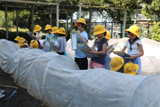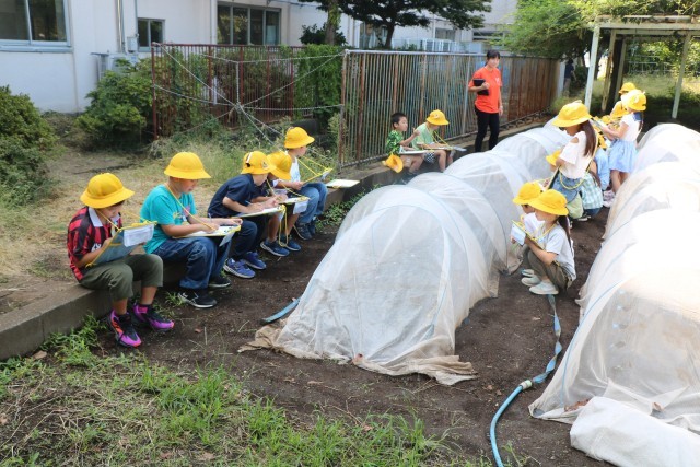 1年生生活科の様子です。畑に行って先週撒いた大根の様子を観察に行きました。先週みんなが種まきした後、先生たちがすぐにネットをかけてくれたり、散水ホースをセットしてくれたので、順調に育っているようです。「僕の〇からは4つも芽が出ている」「わたしはまだ2つしか出ていない」「カイワレ大根みたい!」「あれ?もしかしてカイワレ大根って大根なの?」などといろいろな発見をしながら観察しています。