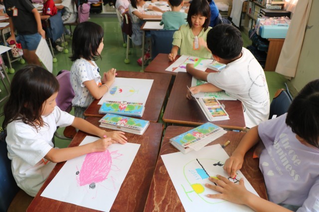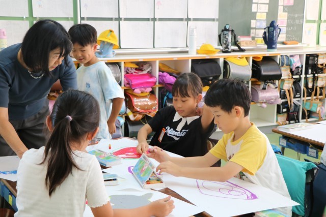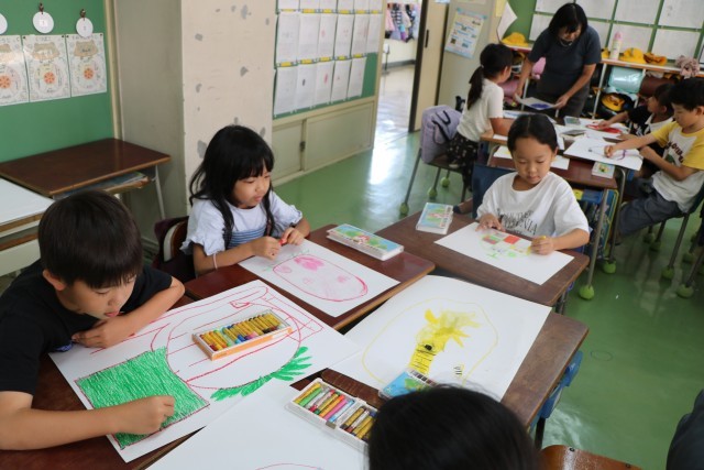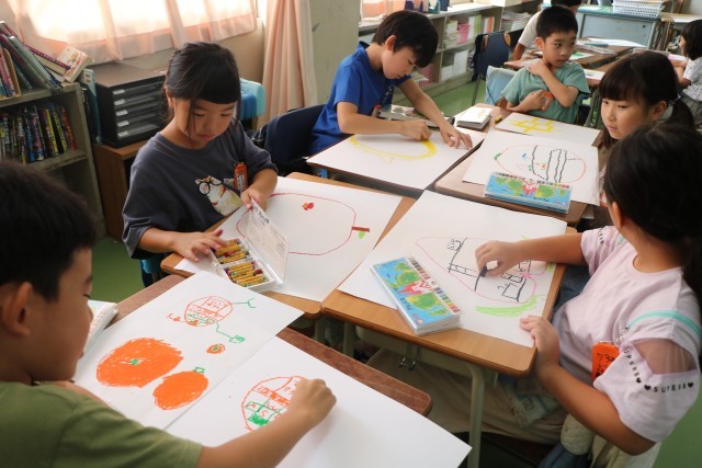 2年生図工の様子です。大きな大きな果物が何かに変身しています、何に変身するのかな?それぞれ自分の好きな果物や野菜からいろいろなことを想像して作品にしています。