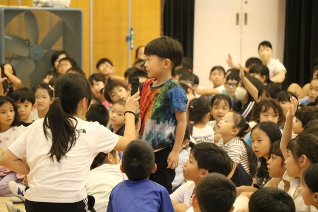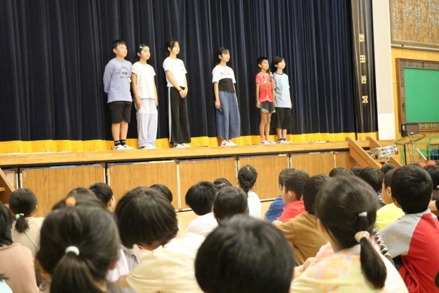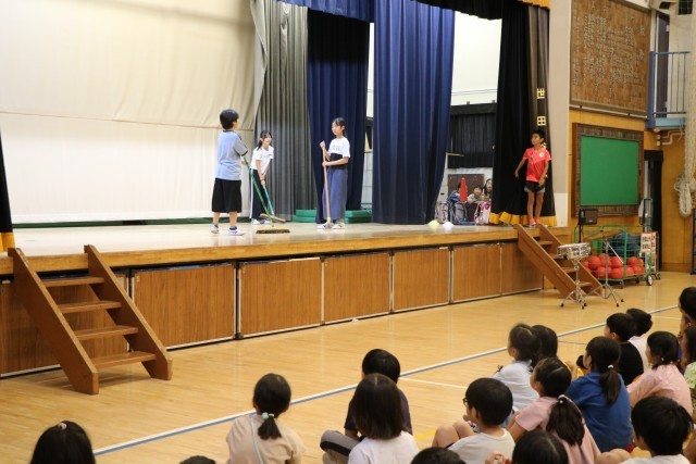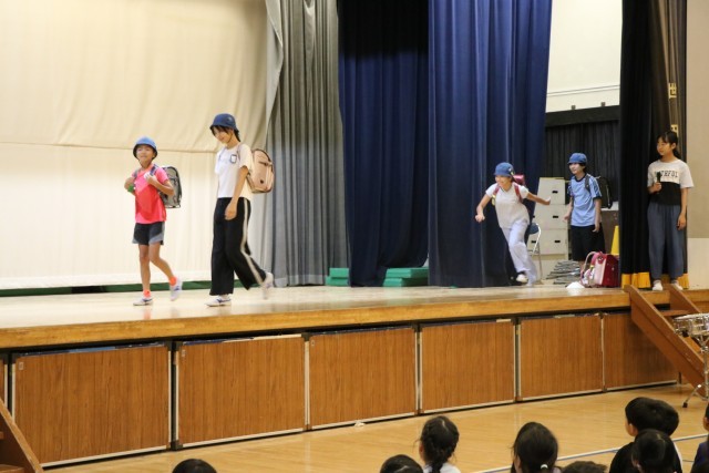 代表委員会による「学校の決まりを思い出そう」集会です。「夏休みで学校の決まりを忘れてしまった人はいませんか?決まりを守ってみんなが安全で気持ちよく過ごせる砧小学校にしていきましょう。」そんな思いを込めてクイズ形式の集会でした。決まりを守らない場面を劇風に表現し、間違っているところを発表します。休み時間ボールをキックして遊んだり、掃除中ほうきで戦いごっこをしたりする場面を見ると「え~あれは駄目でしょう」「あんなことやってないよ」という声がたくさん聞かれます。