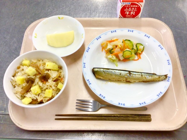 毎月19日は食育の日です。今日の給食は秋が旬の食材を使って、秋を感じる献立にしました。