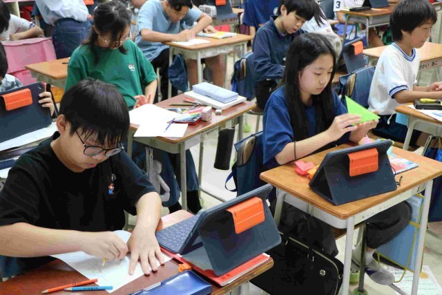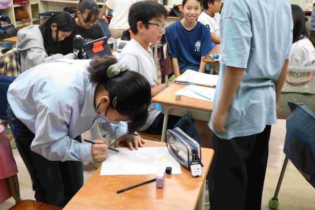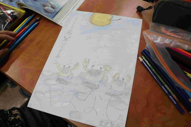 学習のまとめでお話の表紙になるような絵を描いていました。お話の内容や筆者の主張に合ったサブタイトルやPRコメントをつけている子もいました。