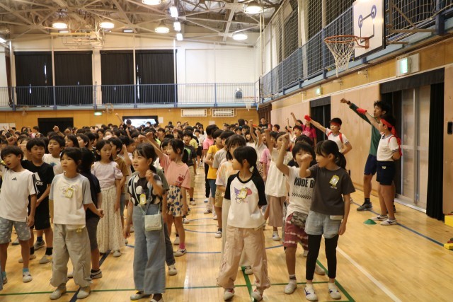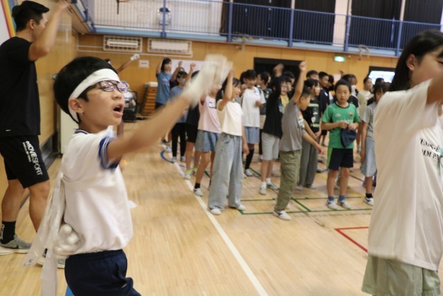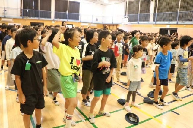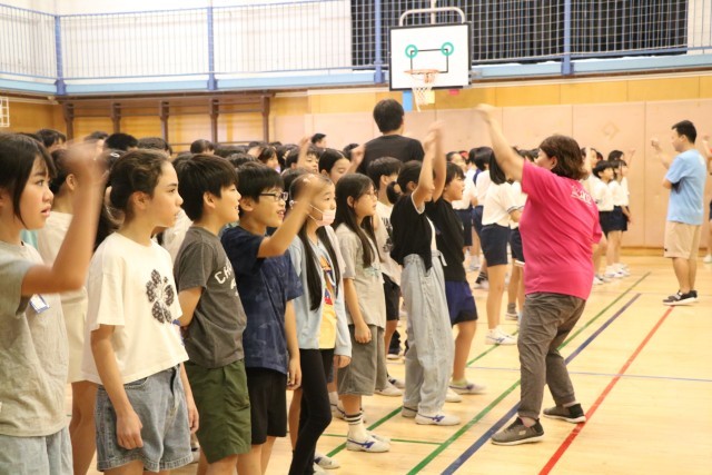 スローガン発表の後は運動会で歌う「ゴーゴーゴー」の練習を応援団と一緒にしました。1番は白、2番は赤、3番は白赤両方で歌います。3番は白赤に分かれて掛け合いがある部分で、ハーモニーもきれいで楽しくなる曲です。