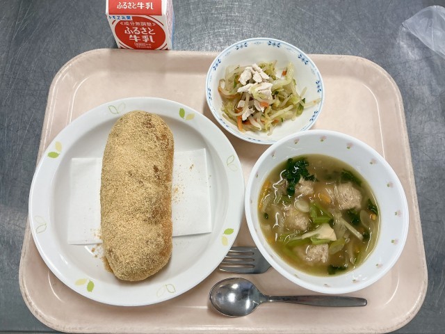 きなこ揚げパンはリクエスト給食です。肉団子入り春雨スープも隠れた人気メニューです。