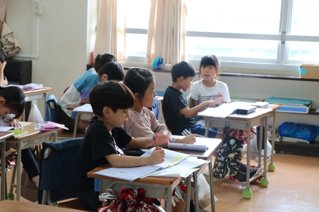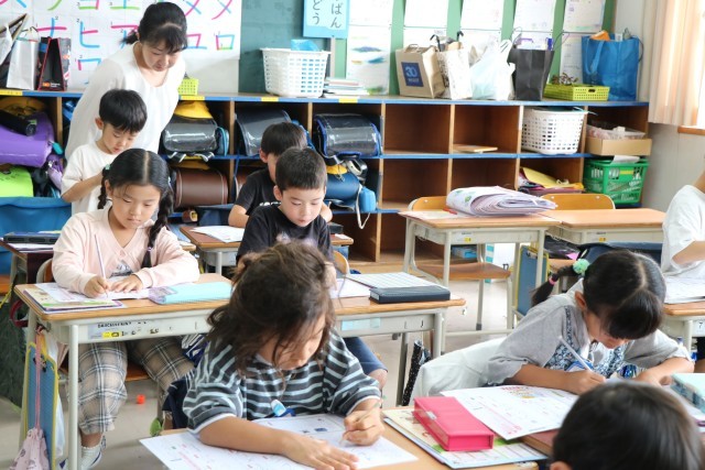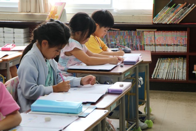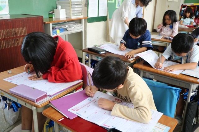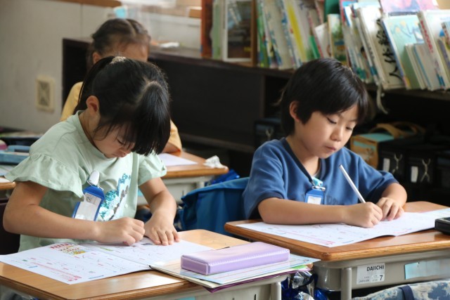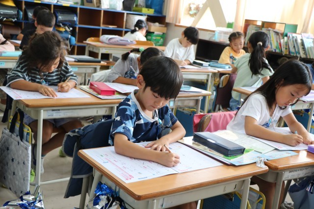 1年生書写の様子です。運動会の練習は元気いっぱい1年生ですが、集中するときは静かに、真剣に頑張ります。今日はカタカナの練習や、新出漢字の学習に取り組んでいました。