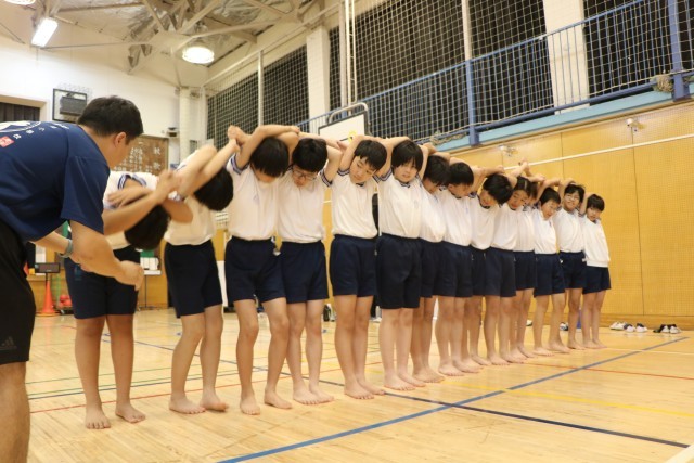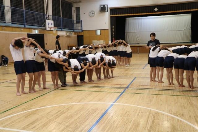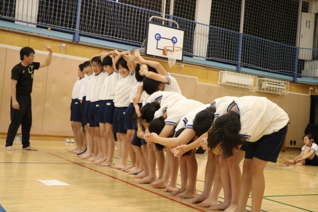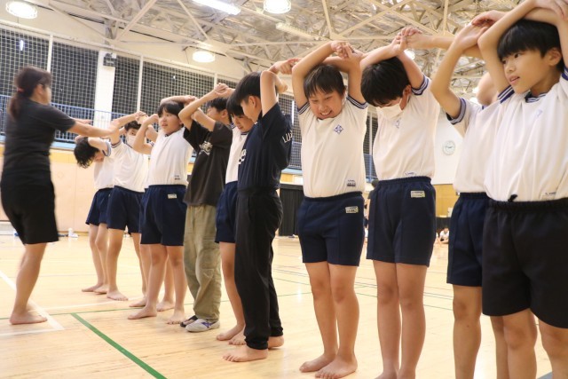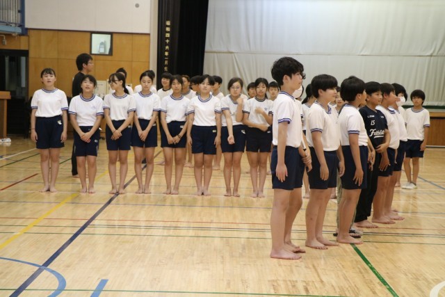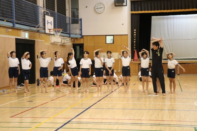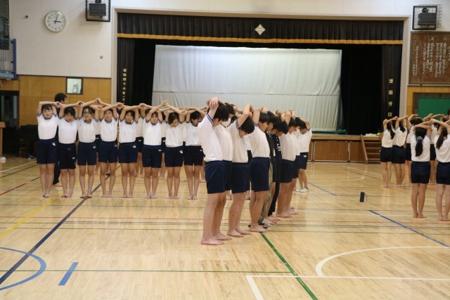 6年生学年体育の様子です。今日はウェーブの練習を集中的にやります。はじめはクラスごとの練習で楽しさ半分、笑顔で取り組んでいましたが、だんだん本気モードになり、終盤には学年合わせて音楽に合わせて動くことができました。さすが6年生です。