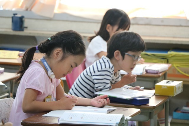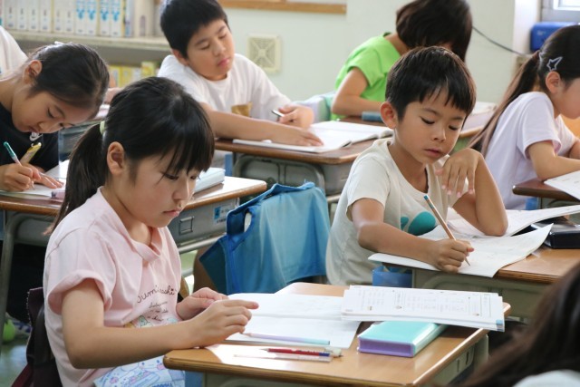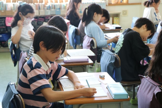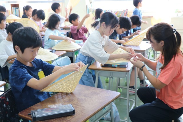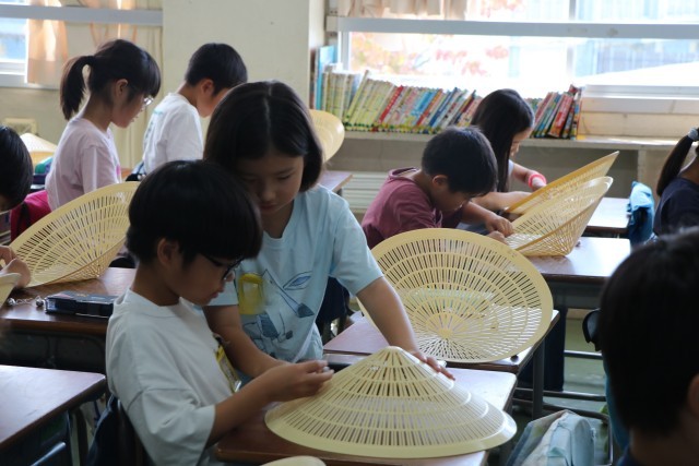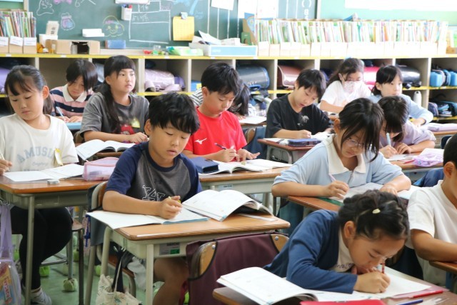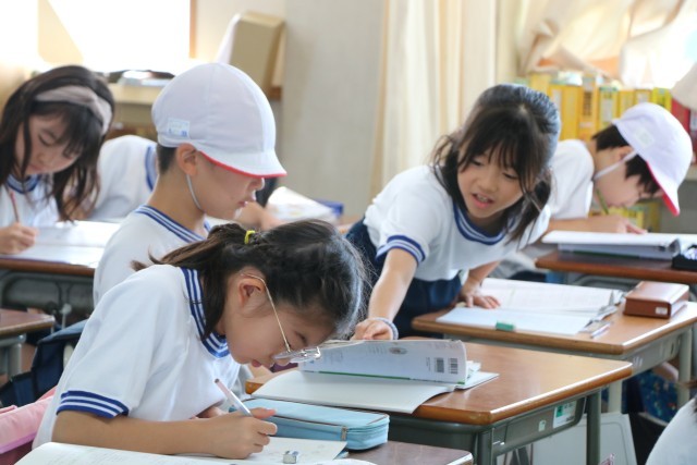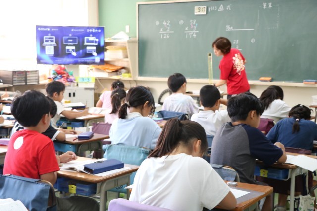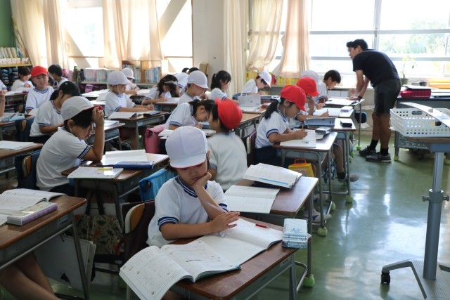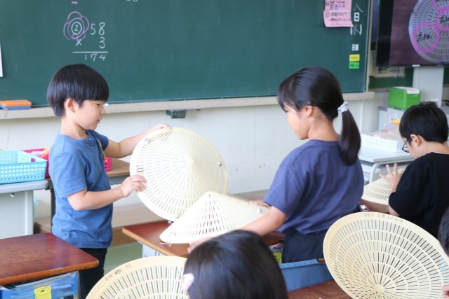 3年生の様子です。算数「かけ算のひっ算」を勉強しています。2位数×1位数のひっ算の仕方について練習問題に取り組み、最後の空いた時間で、運動会の小道具作りに挑戦します。細かい作業なので互いに助け合いながら仕上げます。小道具を完成させ、これを手にもち踊るのが楽しみです。