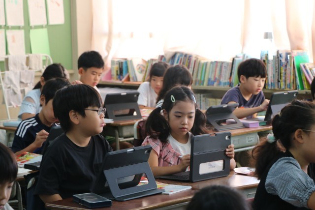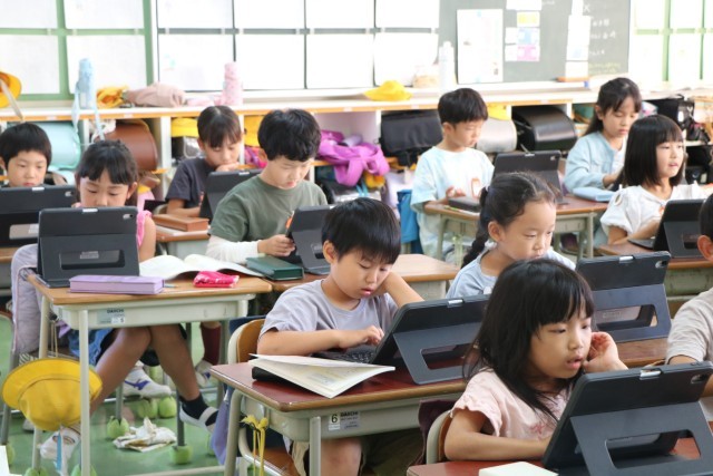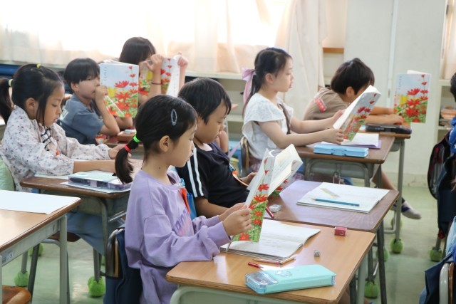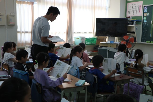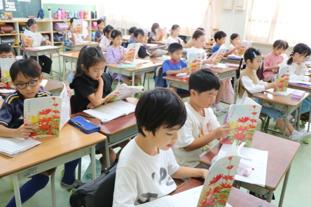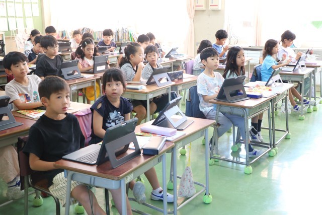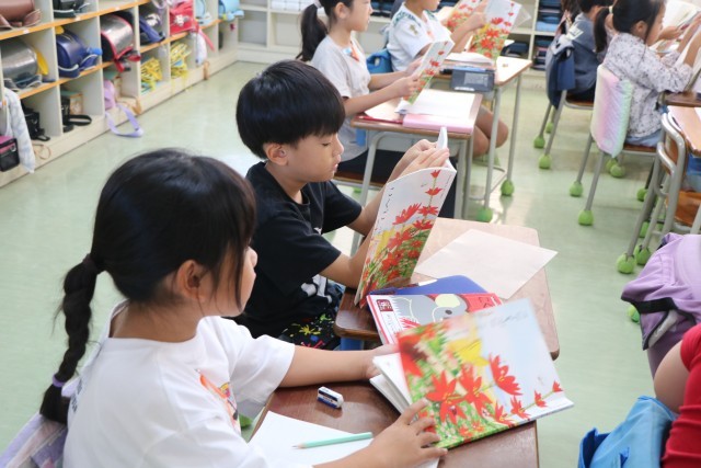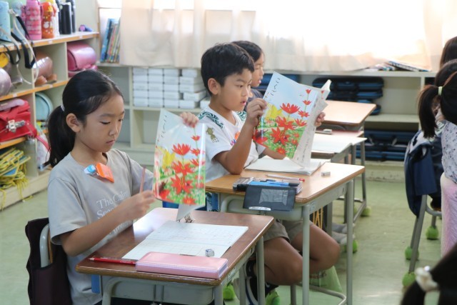 2年生国語、物語文の学習の様子です。さし絵から、物語の全体の流れを確認したり、みんなで場面ごとに音読したりしています。