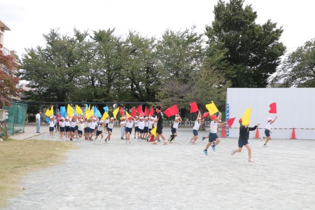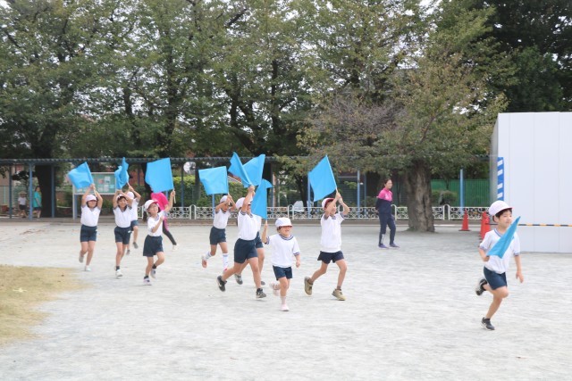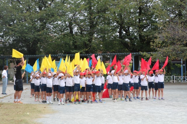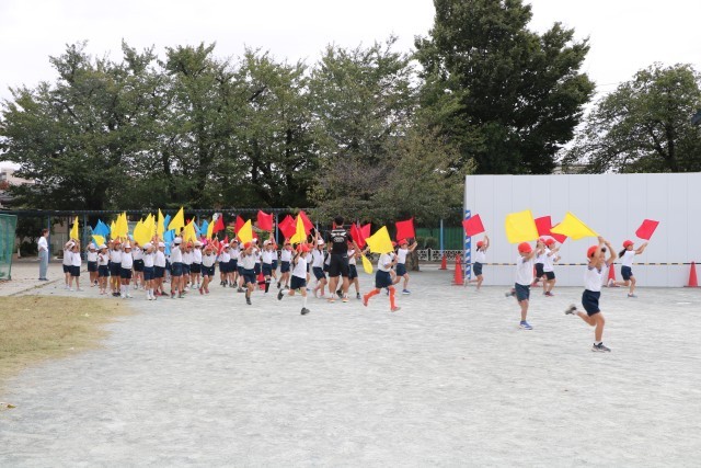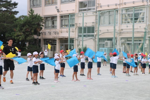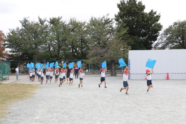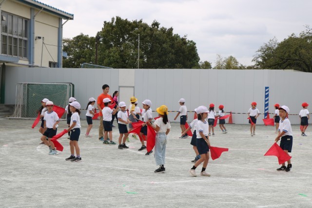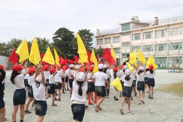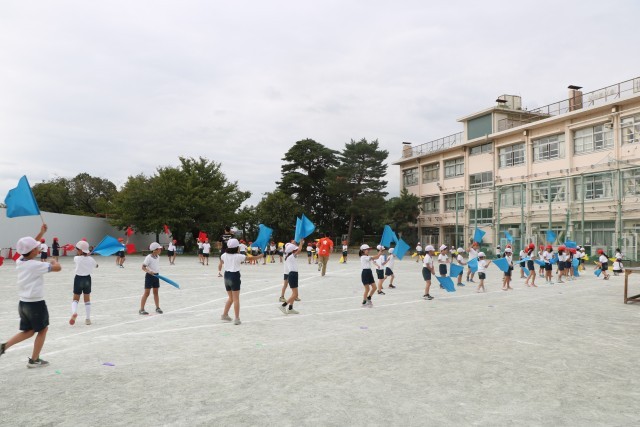 2年生学年体育の様子です。校庭を使って練習するのもあとわずかです。かっこいいダンスも、フラッグさばきもだいぶ仕上がってきました。今日は入場のところから練習です。