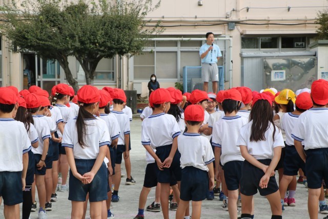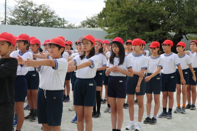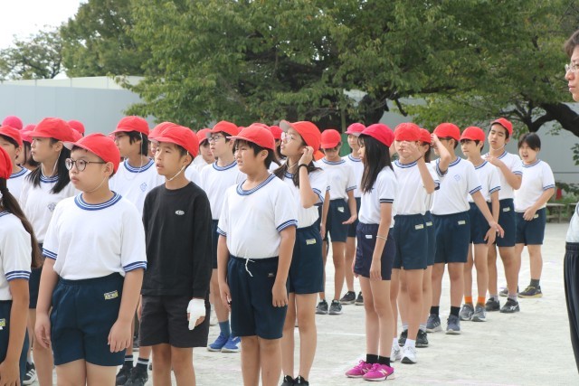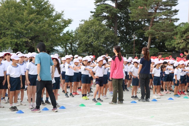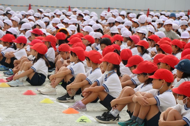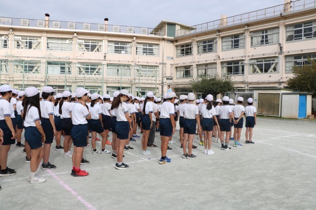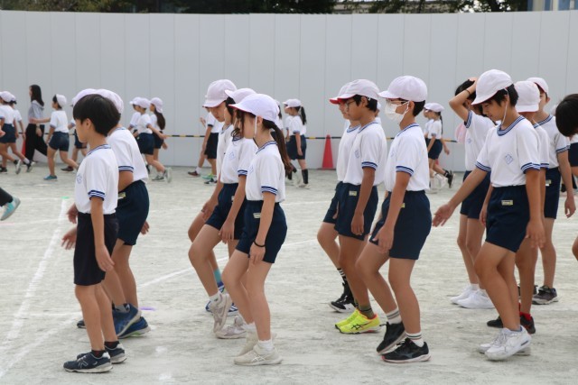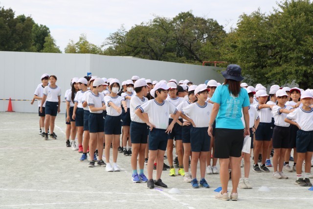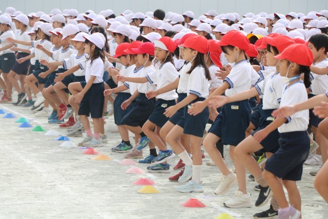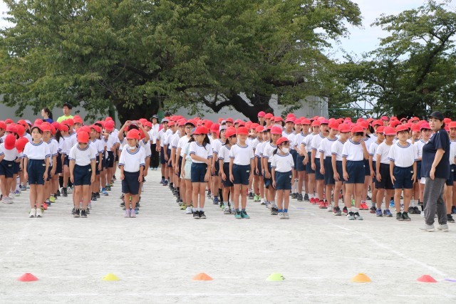 体育朝会の様子です。全校一緒に開会式の入場の仕方を練習します。1年生にとっては初めての運動会、周りのお兄さんお姉さんを見ながら練習を頑張っています。