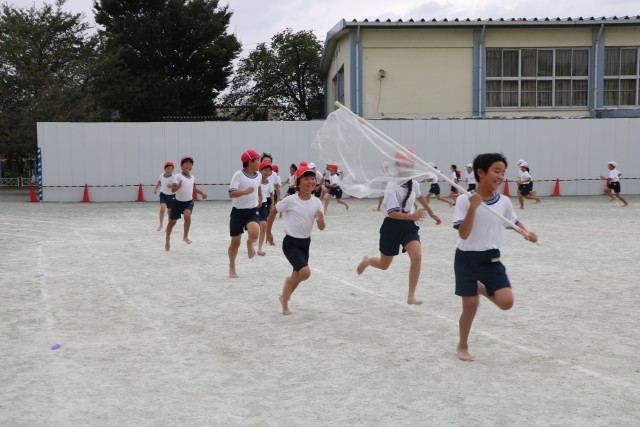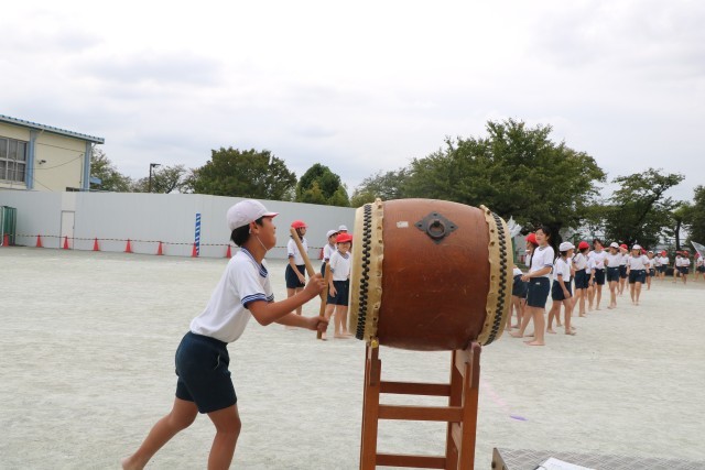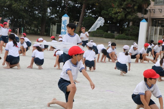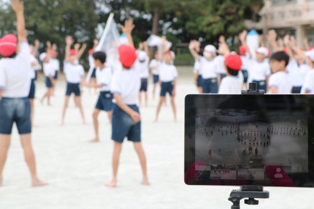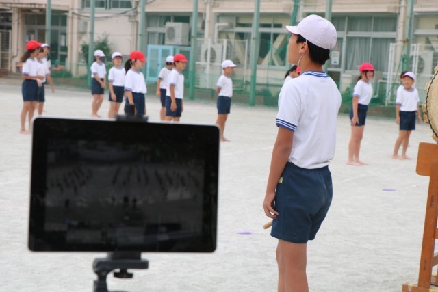 5年生の学年練習の最中、映像テストを行いました。今年度は校庭が狭く、保護者の皆様には譲り合ってご観覧いただきたくお願いいたします。そこで、体育館に大きなスクリーンを出して、外の様子をライブ映写する予定です。休憩場所としてお使いいただきながらご覧いただけます。