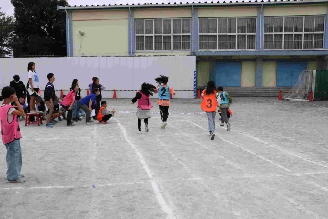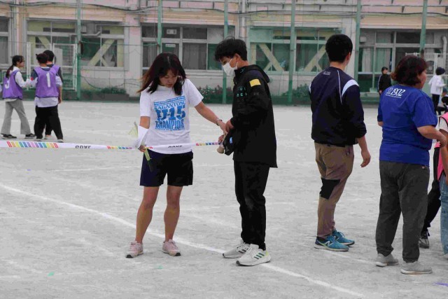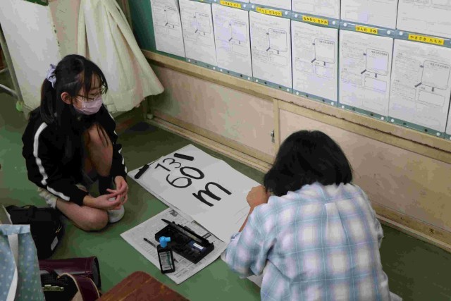 写真は、プログラム係と審判係の活動の様子です。プログラム係は、短距離走の着順判定や着順ごとの整列のリハーサルを入念にしていました。