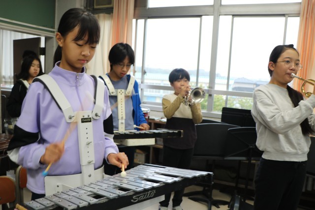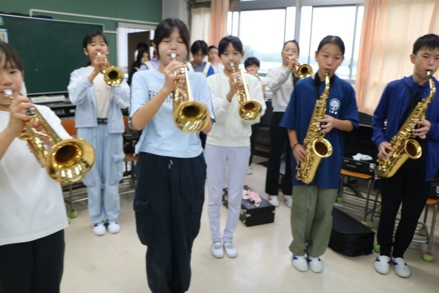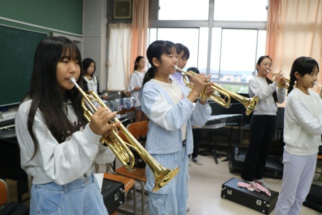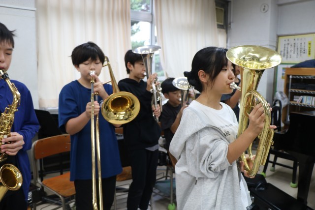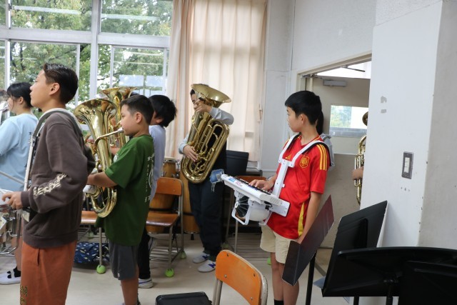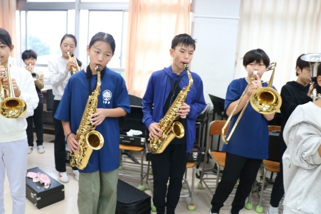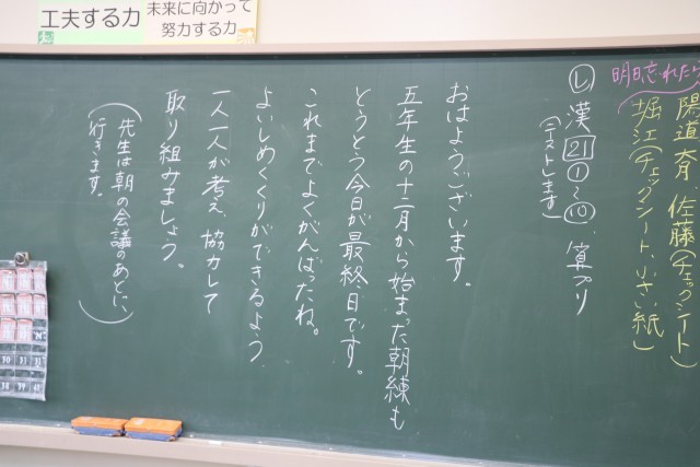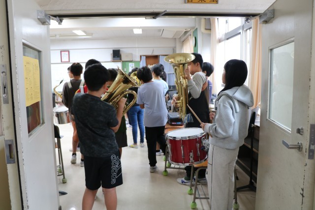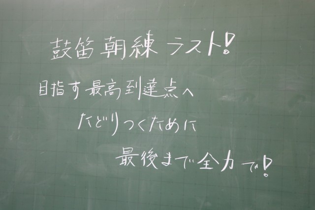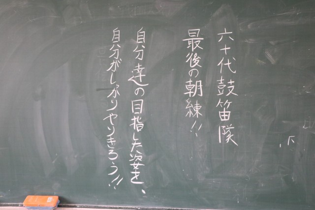 音楽室はまさしく、あふれかえる子どもたちと、やる気で一杯です。担任の先生たちからの熱いメッセージに迎えられ、最後の練習を頑張る6年生です。