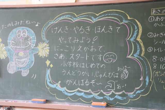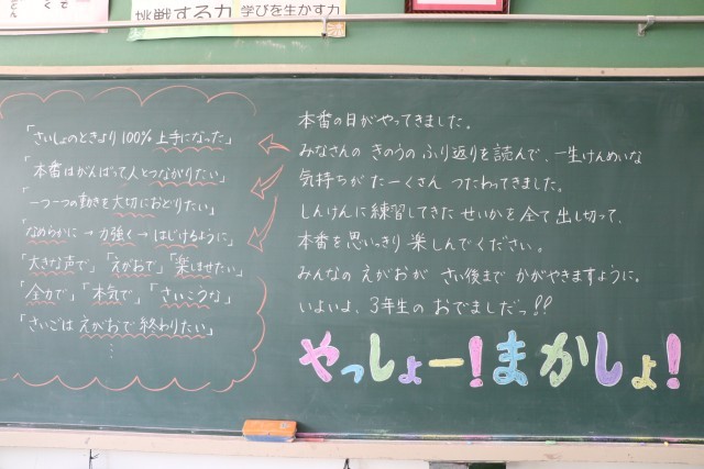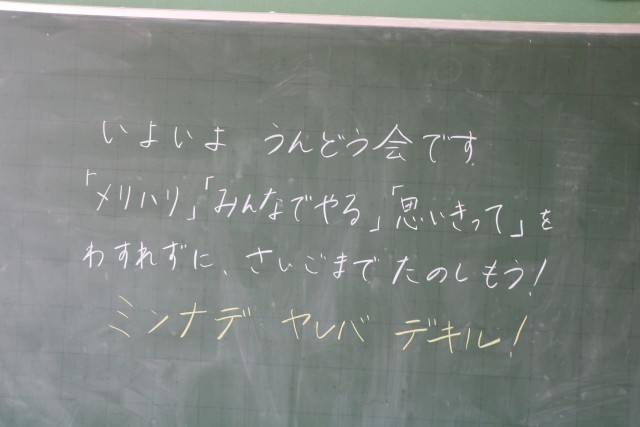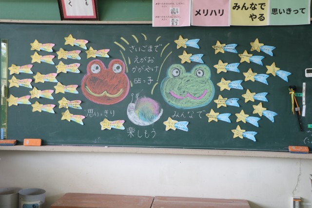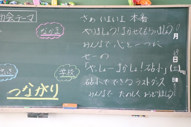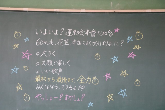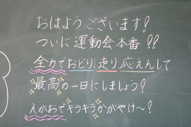今朝の子どもたちを迎える黒板の、ほんの一部ですがご紹介します。子どもたちと先生一緒になって創り上げた運動会だ!!というのが伝わります。下校するとき、精一杯やり切ったー!!という思いを子どもたち自ら追加したクラスもありました。