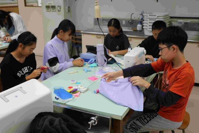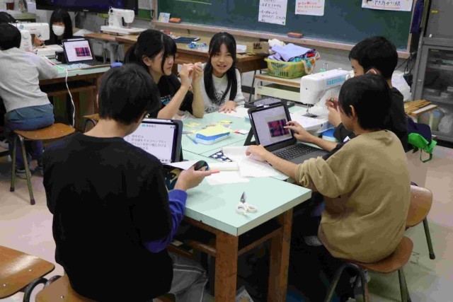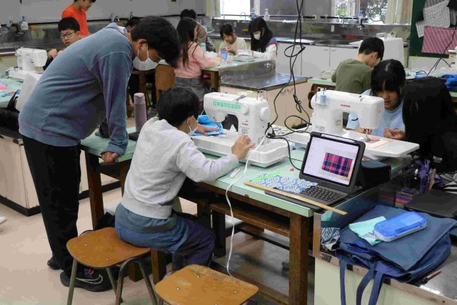 ミシンの扱いにも慣れてきました。それぞれの工程で分からないことが出てきたら、黒板で確認したり、ロイロノートに送られている資料で確認したりして、自分で進められることが多くなってきました。