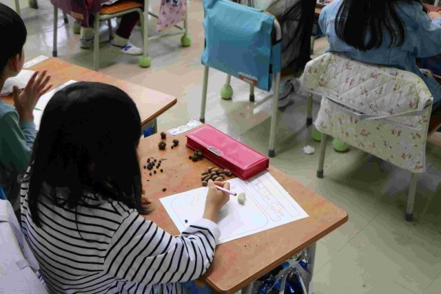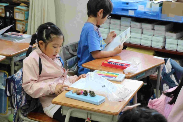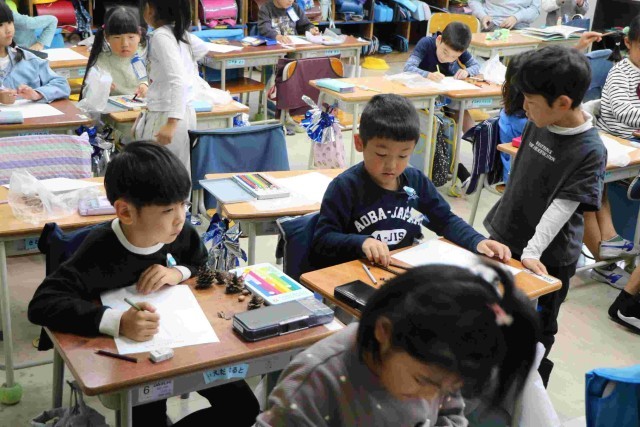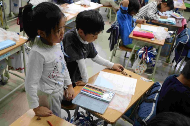 1年生の生活科の様子です。秋探しで見つけてきたものを使って、おもちゃをつくろうという活動をしました。
