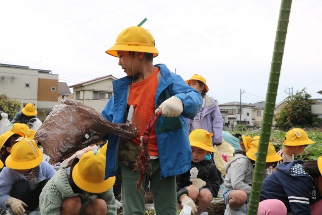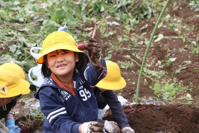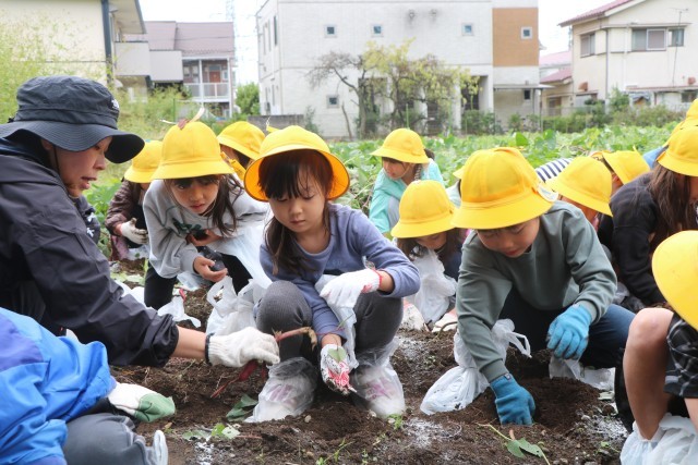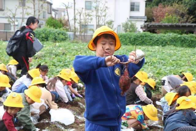 1年生が学校近くでいつもお世話になっている地域の方の農園へ行って、サツマイモほりに行ってきました。広いサツマイモ畑には青々としたサツマイモの葉で埋め尽くされている中、今日砧小の1年生がやる部分は、わかりやすく草を刈って準備をしていただいてありました。一人一株、土を優しく掘りながらサツマイモを取り上げます。たくさん土を触って、サツマイモだけではなく、たくさん虫を探したり秋探しをしたり楽しい校外学習でした。