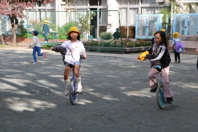 子どもたちの人気朝遊びの一つに竹馬、一輪車があります。高い竹馬に乗る子もいれば、補助付きで練習する子、片足竹馬を楽しむ子など様々です。