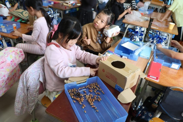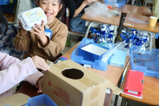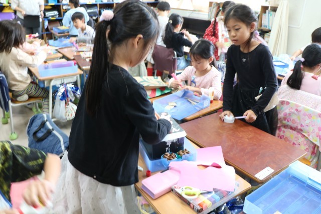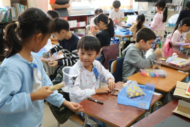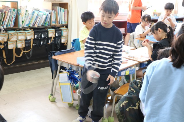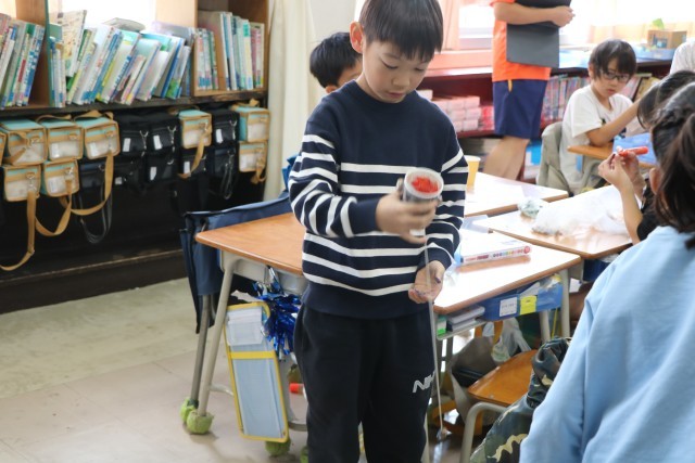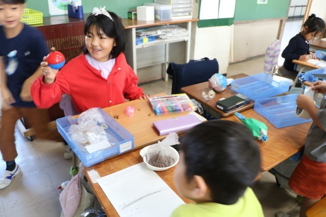 1年生生活科「あきとともだち」おもちゃをかんせいさせよう・・・の様子です。幼稚園の子と一緒に遊ぶおもちゃを作っているそうです。けん玉も上手に遊べて、きっと幼稚園のお友達も楽しんでくれることでしょう。