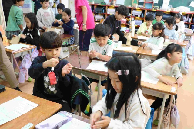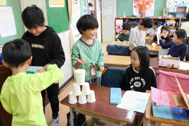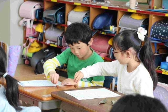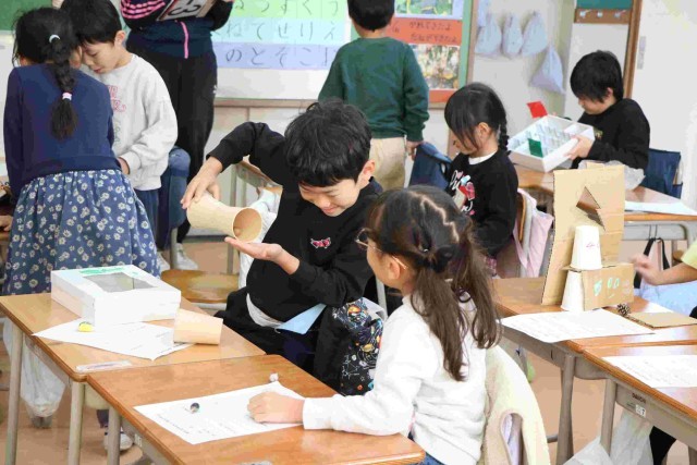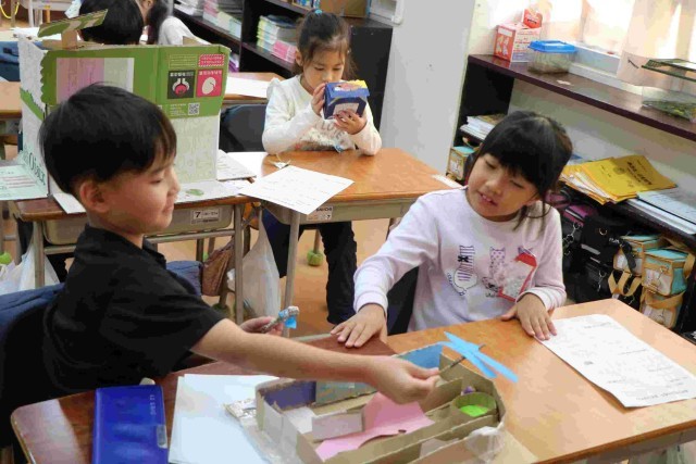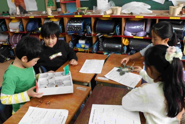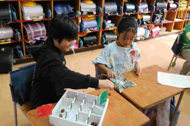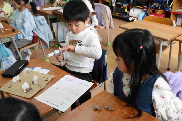 秋探しで見つけたどんぐりや松ぼっくりなどを使ったおもちゃが完成しました。今日はそれを使って遊んでみようという授業をしました。