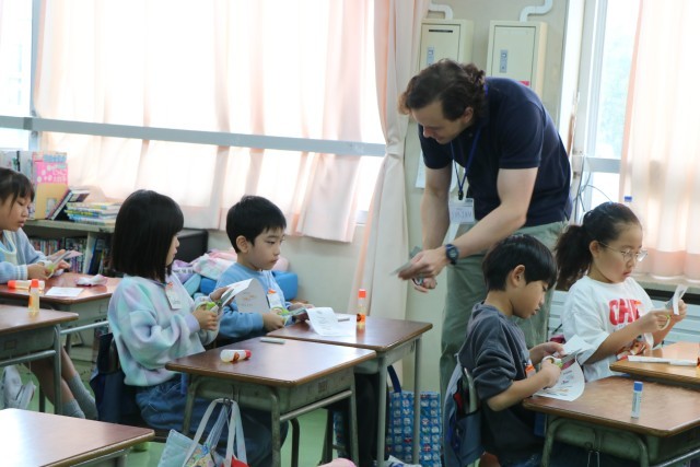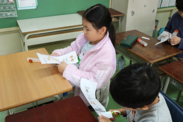 ALTの先生のもっているカードで、みんなで繰り返し練習した後は、2人1組で同じカードを切って、そのカードを使いながら会話の練習です。