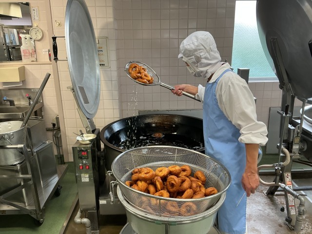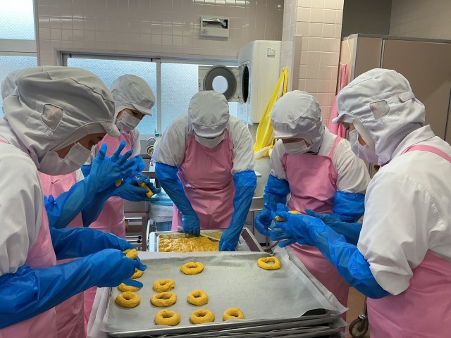 ハロウィン献立として、カボチャを入れたドーナッツを給食室で手作りしました。