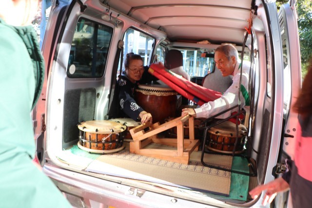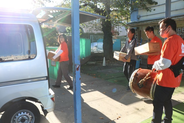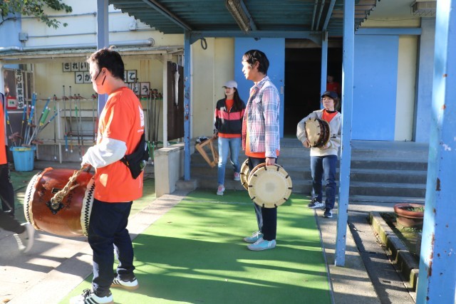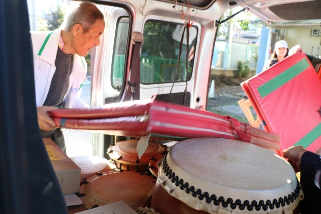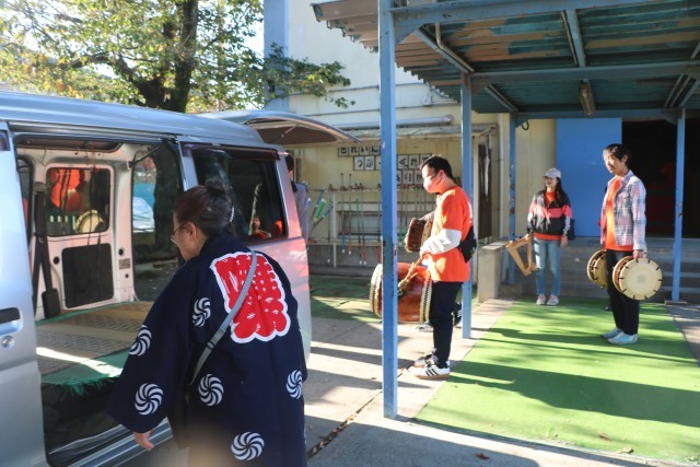 写真は早朝、学校にある道具を運び出す様子です。保存会の皆様はじめたくさんの先生たちも応援に駆けつけています。