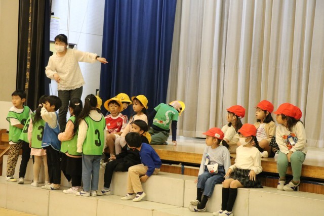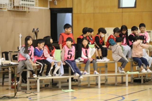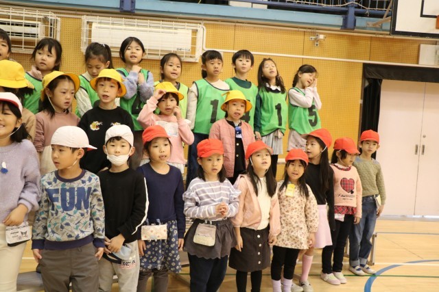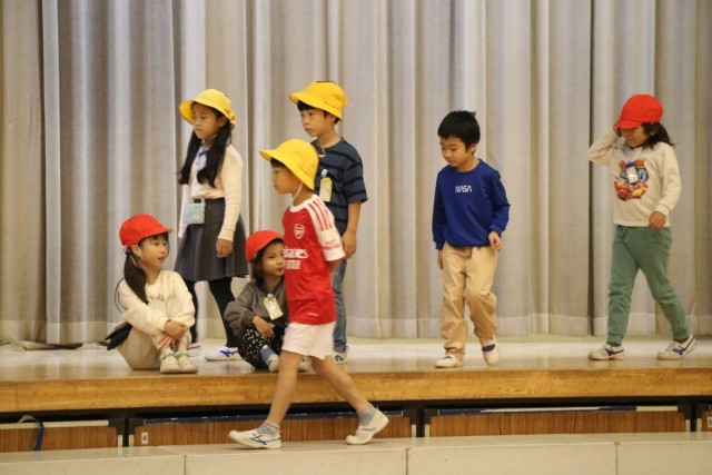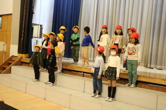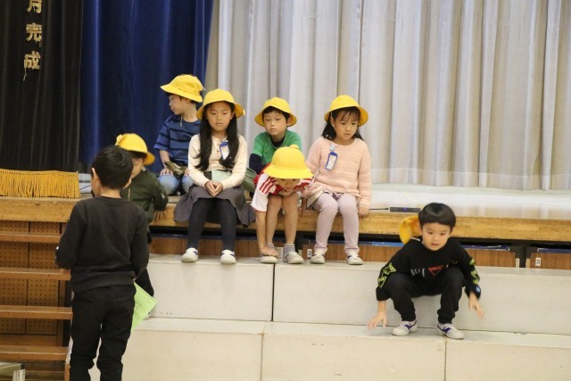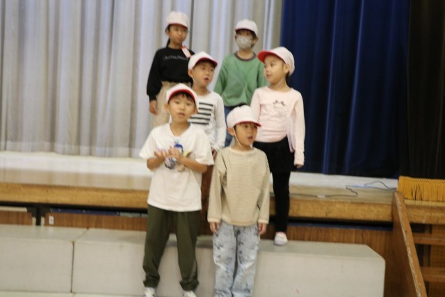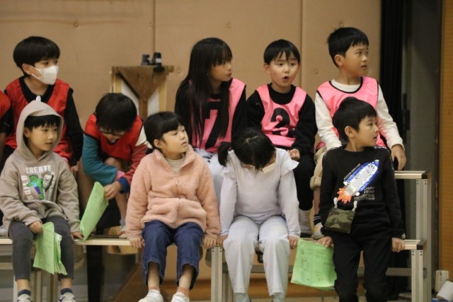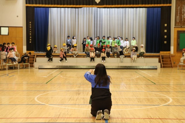 写真は1年生の練習の様子です。みんなで歌うところは元気よく歌い、友だちの演技しているところはしっかり見ている1年生です。