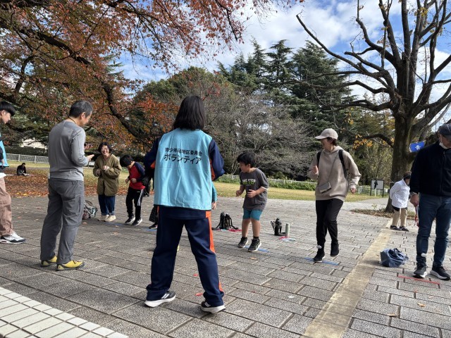 大蔵運動公園、砧公園に設定されたゲームポイントを回るスタンプラリーです。ゲームは「スリッパ飛ばし」や「フライイングディスク」など9種類もありました。砧っ子も多数参加していました。秋晴れの気持ちの良い晴天の元楽しいゲームがたくさんありました。