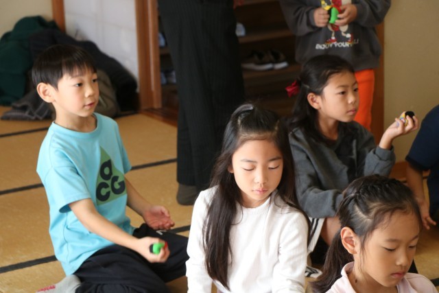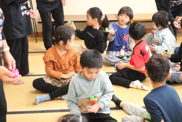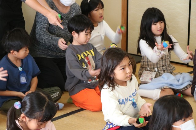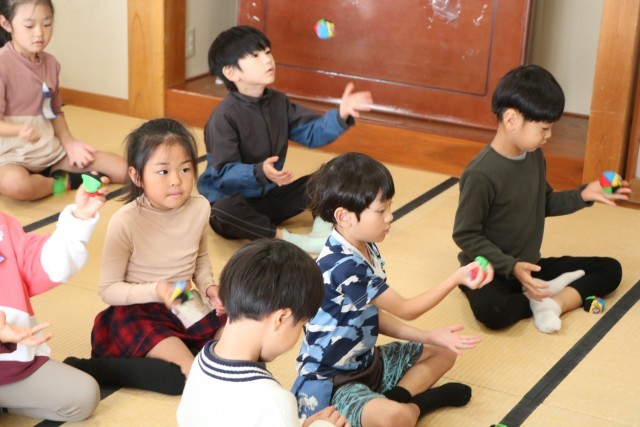 始めは、お手玉1個から手で交互に握ったりキャッチボールをしたりしながらなじむように練習します。そして2個使って1つを高く上げながらもう一つはキャッチボールのように空いた手にに受け渡す・・・何度も何度も楽しそうに繰り返します。