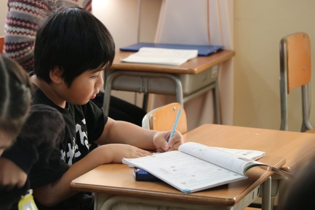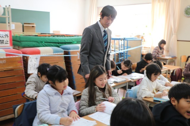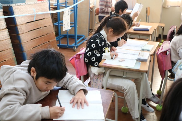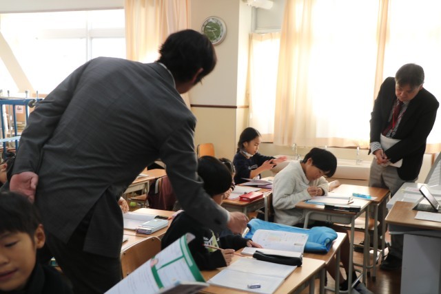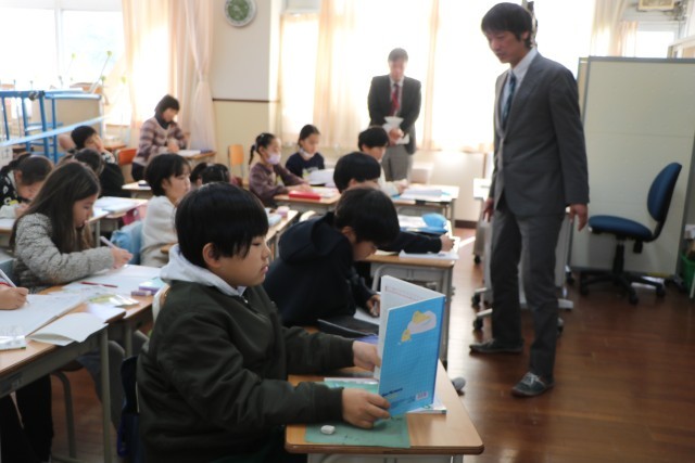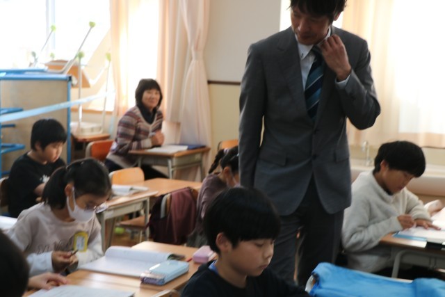 3年生算数「小数の大きさを比べよう」の学習の様子です。3学級を4つに分けて学習します。算数専科の先生が2学期は育児休暇を取っているため、単元によって、担任の先生が授業をしたり、副校長先生がしたりします。頑張って問題に取り組んでいる様子を、副校長先生は一人ひとり名前を言って声をかけながら見ています。